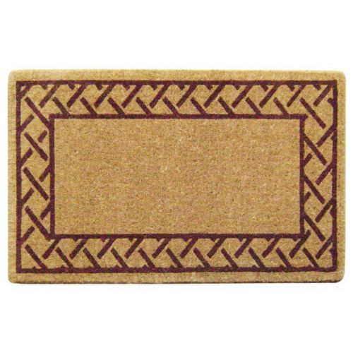 Heavy duty rectangle shaped doormat with trellis border measures 22" × 36". Made from 100% coir fiber. Coir is a natural fiber extracted from the fibrous husk of coconuts. Tough coir bristles are excellent for scraping dirt off shoes and absorbing moisture. Coir mats are hand-woven by artisans using century old techniques on traditional wooden looms. They are 100% natural, biodegradable, compostable and environmentally friendly. Coir fiber is naturally mold and mildew resistant.