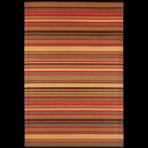 5' × 8' Stripes warm brown outdoor carpet mat by MadMats. Totally durable for outdoors. Made of 98% recycled plastic. Great for patios, outdoor spaces and pool sides. Resistant to rain, snow and sun all year round. Just hose it down with water for cleaning. Colors UV treated and resistant to sun. Sold in one solid piece. Available in the 5 × 8 only. Comes rolled, not folded. Each side is equally stunning.