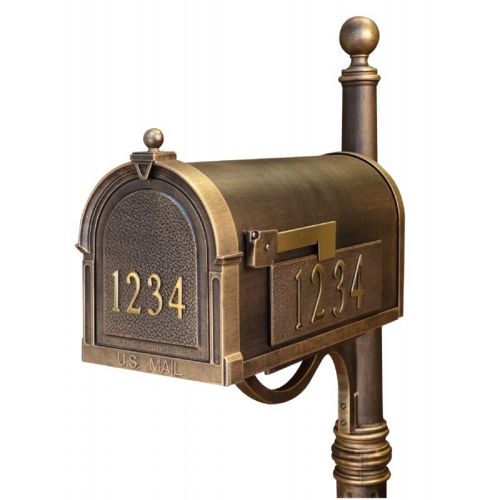 The Berkshire Curbside Mailbox presents an impressive face. The one piece cast aluminum door features deeply cut details with a rich, leather grain textured panel. The stainless steel spring hinge and magnetic catch will keep the door secure and the rust proof cast aluminum body construction creates a weather resistant mailbox. This mailbox includes two side mount address plaques and 3" high self adhesive numbers for the side and 2" high self adhesive numbers for the front of the mailbox. Numbers are available in brass or stainless steel.