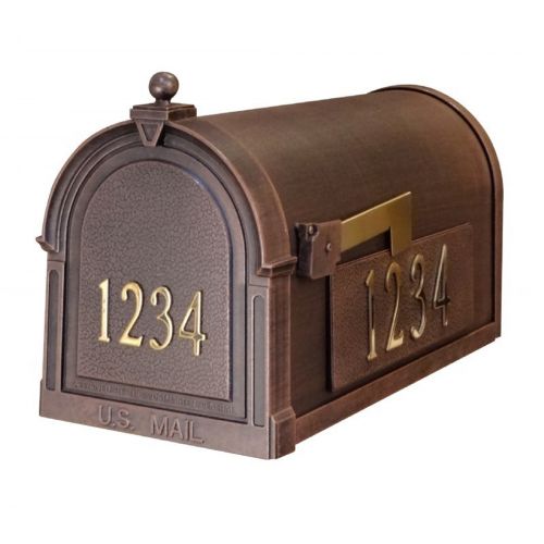 Special Lite LogoThe Berkshire Curbside Mailbox presents an impressive face. The one piece cast aluminum door features deeply cut details with a rich, leather grain textured panel. The stainless steel spring hinge and magnetic catch will keep the door secure and the rust proof cast aluminum body construction creates a weather resistant mailbox. This mailbox includes two side mount address plaques and 3" high self adhesive numbers for the side and 2" high self adhesive numbers for the front of the mailbox. Numbers are available in brass or stainless steel.