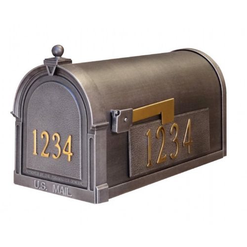 The Berkshire Curbside Mailbox presents an impressive face. The one piece cast aluminum door features deeply cut details with a rich, leather grain textured panel. The stainless steel spring hinge and magnetic catch will keep the door secure and the rust proof cast aluminum body construction creates a weather resistant mailbox. This mailbox includes two side mount address plaques and 3" high self adhesive numbers for the side and 2" high self adhesive numbers for the front of the mailbox. Numbers are available in brass or stainless steel.