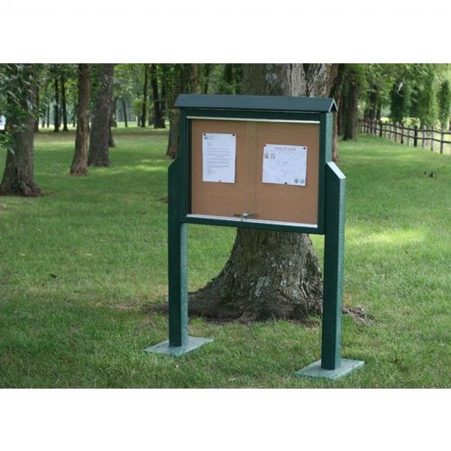 Medium message center resinwood one side, two posts is the industry standard. Don't be fooled by low quality, light weight imitations. It is made with various sized resinwood slats, shatter resistant clear plastic sheet, top quality marine-grade cork, and specially coated locking mechanisms. Posts are made from solid 4" × 4" resinwood boards. It is designed to be weather resistant and available in standard colors of green and cedar.