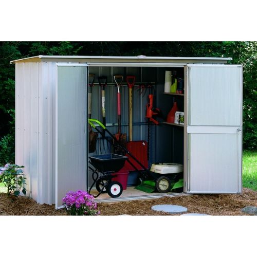 Arrow Garden 8 × 3 standard shed. It has break-resistant glazed wall panels and its steel parts are made of durable, electro-galvanized steel. This economical garden shed is perfect for your yard essentials, gardening tools and more. This simple and efficiently designed shed is attractive whether free-standing or against a wall. You may roll your wheelbarrow inside with ease through its large swing-out doors and stand up tall with its high ceiling. It has a locking handle for storage security and includes floor frame, four wide shelves and a tool hanger rack.