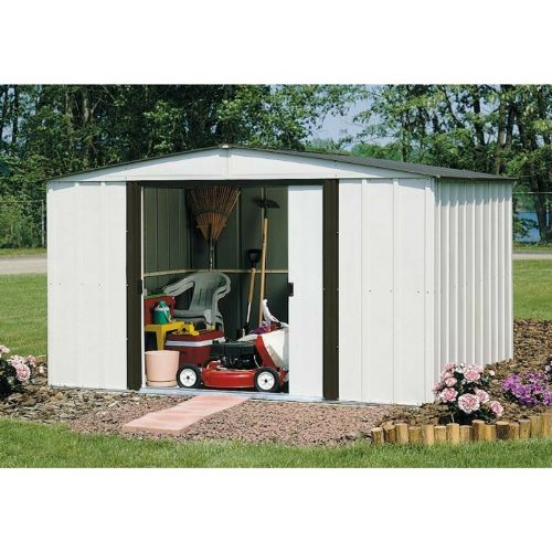 Arrow Newburgh 8 × 6 storage shed. It is made up of sturdy electro-galvanized steel. Its stylish gable design lets you organize tools, yard equipment and other seasonal items in a safe, secure location. It is also the lowest cost storage solution and it is easy to assemble.