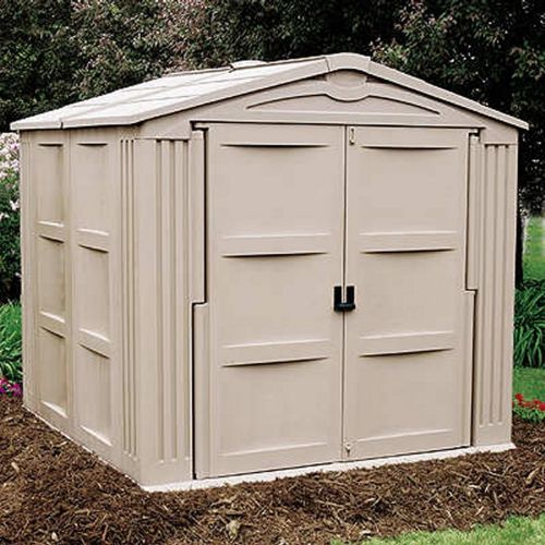 Large storage building shed with 311 Cubic foot capacity. Front opening is extra-wide and allows easy access for large items to store. Opening is 62 inches wide × 69 inches High. Strong corner-column construction. Large panels allow fast snap-together assembly. Ideal for storing large items like outdoor furniture, tractors, motor bikes, ladders and yard equipment. Lockable doors with upper and lower latches. Long lasting resin construction. Made for outdoors. Resistant to sun, cold and outdoor conditions. External Size: 7' 9 ¾" W × 7' 10 ¾" D × 7' 3 ½" H. Internal Size: 7' W × 7' D × 6'6" H. Color: Taupe.