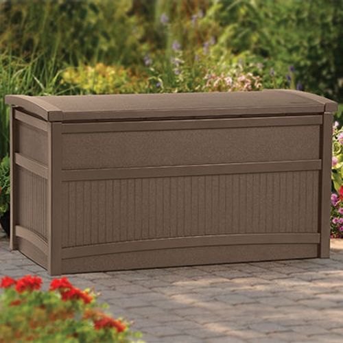 Outdoor storage deck box with 50 gallon capacity. Ideal for storing cushions, tools, garden and pool accessories. Easy assembly, no tools required. Stay dry design. Resistant to UV rays and harsh weather conditions. Long lasting resin construction. Handles for easy carrying. Wheels for mobility. External size: 41" W × 21" D × 22" H. Internal Size*: 37 ⅛" W × 17" D × 19" H. Color: Bronze.