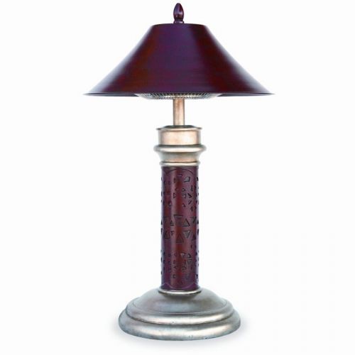 Montage table lamp style electric patio heater. This beautiful electric heater can heat up to 12 feet diameter. Perfect for cool evenings. Heater has a 1,200 W Halogen Bulb which is equivalent to approx. 4,095 BTUs of heat. It has 8 Ft. cord that uses a standard 120V grounded outlet. Automatic shutoff tilt switch. Made with weather resistant hardware. Requires simple assembly. Size: 22" L × 19.7" W × 33.5" H.