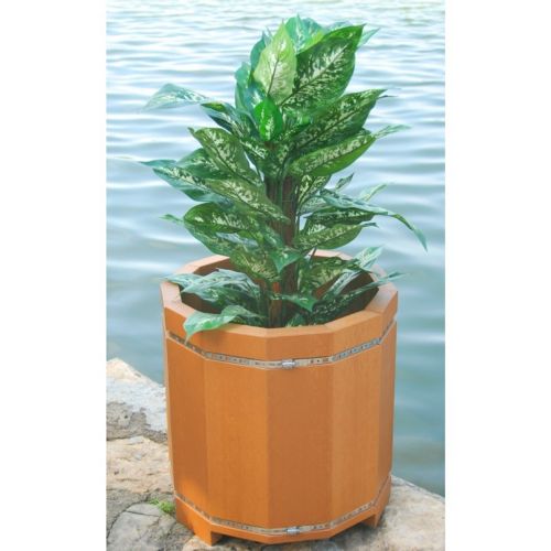 Planter resinwood 20 inch is made with twelve 2" × 6" resinwood slats that are beveled to create a circular shape. Three of the 2" × 6" slats are slightly longer to create a solid footprint. It is 20 inches wide and very durable. It is available in standard colors of green, cedar, black, white, and gray. There are two heavy duty, worm-drive hose and tube clamp kits hold the planter together.