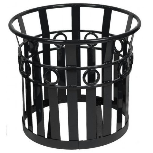 Large round outdoor planter. Made of durable, flat bar steel. Decorative band at top adds style to durability. Comes with plastic liner.