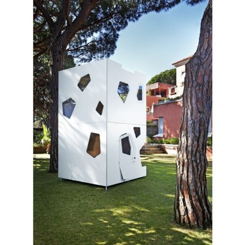 Kyoto Maxi is the two story garden playhouse with fourteen windows. Double the floors and double the fun and functionality. The Kyoto outdoor playhouse is inspired by the Japanese avant-garde architecture. Kyoto playhouse is made to be left outdoors. What characterizes this outdoor playhouse is the large number of windows with different geometrical shapes which give it an original and futuristic look. The sun filters in through the windows creating a very cozy and special indoor atmosphere, with light and shadows. The ideal place for children to develop their imagination. All corners open for contact are bevelled at a 45 º angle to avoid injury. The methacrylate in the windows is flexible and does not break like glass. The paints used are water-based, suitable for use in toys for children. The doors are designed and protected to avoid fingers being pinched. The indoor flooring in the house is made with non-slip material. The doors always open outwards to avoid them getting blocked with an object from the inside, so that children do not get knocked down by them when playing inside. The playhouses is equipped with three interior downlights on LED, switch and electrical box under flooring.