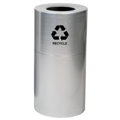 Aluminum recycling receptacle in satin clear coat finish. Open top allows for easy co-mingle recycling and hands-free disposal. Two-piece design creates an overlap area and eliminates the visibility of plastic bags. Comes standard with recycle decal.