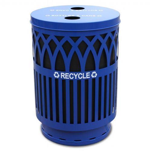 Decorative recycling receptacle with a sleek, laser cut, contemporary design. Comes with a flat top lid with 2 round openings for recycling of cans and bottles. Perfect for city streets, open-air malls, universities, parks, office complexes and many other environments. Made of heavy gauge galvanneal steel with a TGIC polyester powder coat finish for added durability. A protective coated base helps to eliminate paint chipping and rust rings. Comes standard with a rigid plastic liner, leveling feet, lid attachment kit and anchor kit. Recycle decal and lid opening decals included