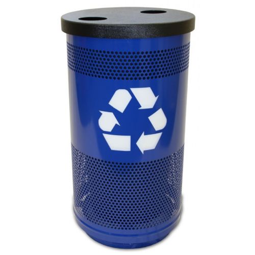Stadium Series 35 gallon perforated recycling receptacle. Comes with 1 round opening in the top which is perfect for single stream recycling. Perfect for indoor our outdoor use. Unit has a chasing arrow recycling symbol laser cut into the center and comes with decals for the lid opening. Comes standard with rigid plastic liner, leveling feet, anchor kit and lid attachment kit.