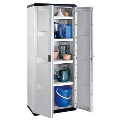 Tall utility cabinet with four adjustable shelves in gray and black. Strong shelves hold up to 75 pounds of weight. Attractive design. Long lasting resin pvc construction. Easy no-tools assembly. Maintenance free. Internal size: 27" W × 16" D × 68 ¼" H. External size: 30" W × 20 ¼" D × 72 ⅜" H. Color: Gray with black accents.