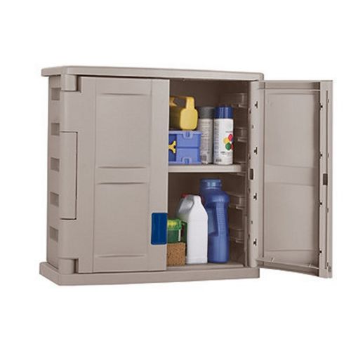 Utility storage cabinet. Strong shelf hold up to 50 pounds of weight. Attractive design. Long lasting resin pvc construction. Easy no-tools assembly. Maintenance free. Shelf is adjustable. Great for bathrooms, garages. Internal size: 25 ½" W × 11 ½" D × 24 ¾" H. External size: 28" W × 13 ¼" D × 28" H. Color: Taupe with blue handles.