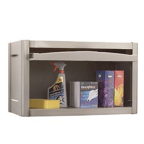 Utility wall cabinet holds up to 100 pounds. Wall brackets included. Attractive design. Long lasting resin pvc construction. Easy no-tools assembly. Maintenance free. Internal size: 29 ½" W × 13 ½" D 11 ½" H. External size: 30" W × 16 ⅝" D × 18" H. Color: Taupe with black handles.