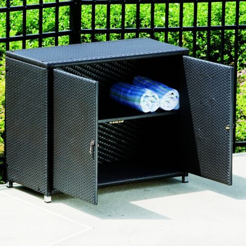 Vento outdoor storage cabinet. Elegant wowen body with aluminum frames. Perfect for poolsides and on your deck. Middle shelf divides the cabinet into two. Compliments your wicker outdoor furniture. Ideal for keeping towels, tools and furniture cushions. Dimensions: 39" L × 17" W × 31" H. Dark chocolate wicker.