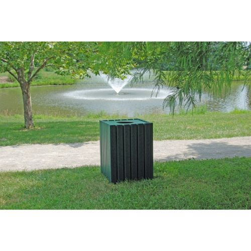 Standard Square recycled plastic trash receptacle is made with twenty-eight 1" × 4" resinwood slats and a recycled plastic structure. It has a standard configuration is open top.It has a volume up to 20 gal. It is available in open side configuration as well. It is also available in standard colors of green, cedar and gray. It is Heavy duty, zinc coated hardware is available. Liner is sold separately.