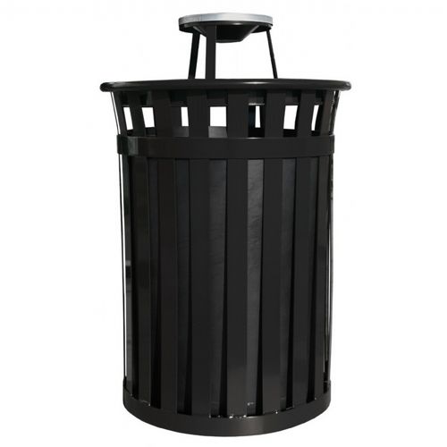 Large capacity, outdoor trash receptacle; perfect for street scapes, cities, universities, parks. Anywhere high traffic waste disposal is needed. Made of durable flat bar galvanneal steel with a powder coat finish that is made specifically for the outdoor environment. This unit comes standard with an ash top, rigid plastic liner, leveling feet, anchor kit and lid attachment kit.