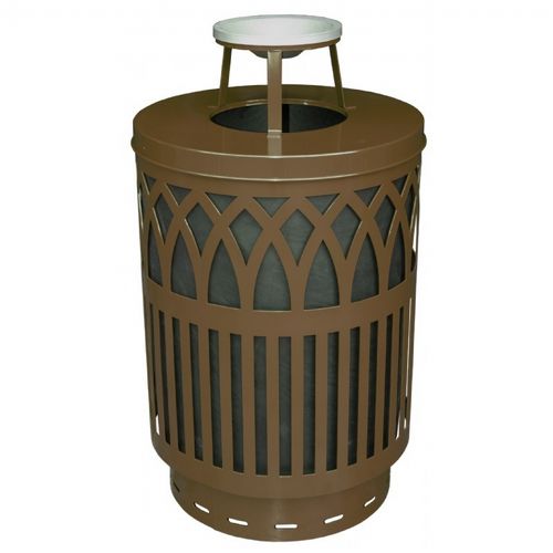 Decorative waste receptacle with a sleek, laser cut, contemporary design. Servicing is easy with a lift-off lid. Perfect for city streets, open-air malls, universities, parks, office complexes and many other environments. Made of heavy gauge galvanneal steel with a TGIC polyester powder coat finish for added durability. A protective coated base helps to eliminate paint chipping and rust rings. Comes standard with a rigid plastic liner, leveling feet, lid attachment kit and anchor kit.