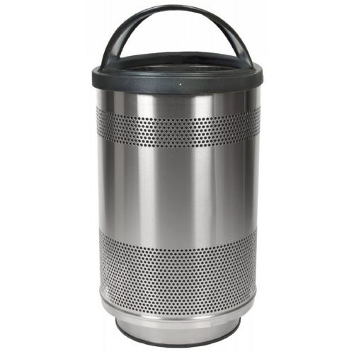 Stadium Series, stainless steel perforated receptacle with hood lid. Comes standard with a rigid plastic liner, leveling feet and lid attachment kit.