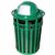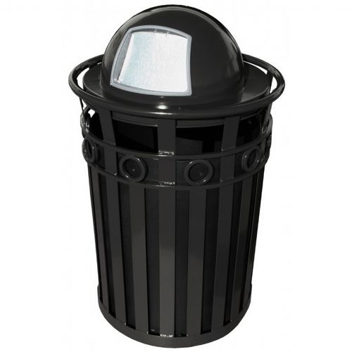 Metal receptacle with dome lid. Made of durable flat-bar steel to defer graffiti. Decorative ring at top adds style to durability. Comes with leveling feet, plastic liner, lid attachment kit and anchor kit.