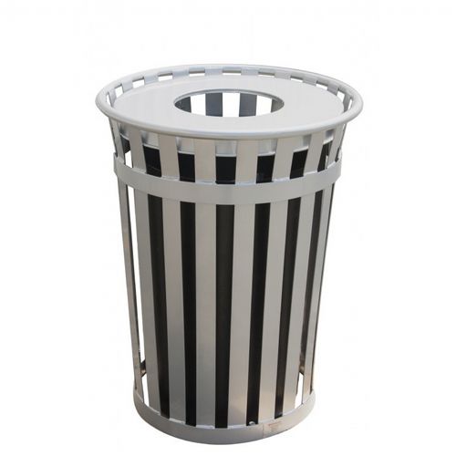 Outdoor waste receptacle made of durable, long-lasting flat bar steel that is a deterrent for graffiti with a metal band at the top that adds strength. The receptacle has a TGIC powder coat finish made to withstand the outdoor environment. Comes with a flat top lid, black plastic liner, stainless steel leveling feet, lid attachment kit and an anchor kit at no extra charge.