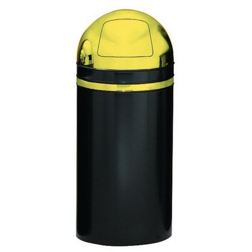 Dome top receptacle with push doors. Features a strong steel shell with a galvanized liner. Self-closing door effectively controls odors. Black unit with brass accents