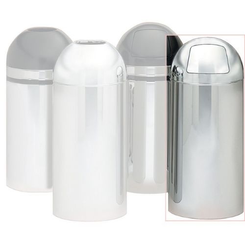 Dome top receptacle with push doors. Features a strong steel shell with a galvanized liner. Self-closing door effectively controls odors. Unit is all polished metal (chrome).
