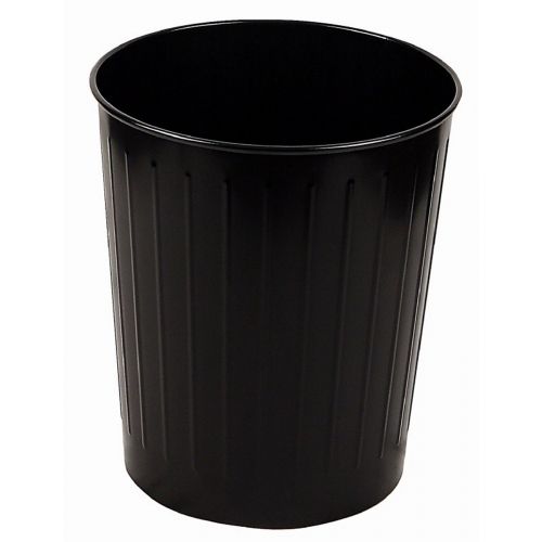 Medium, round wastebasket. Features solid-ribbed construction that adds strength and durability.