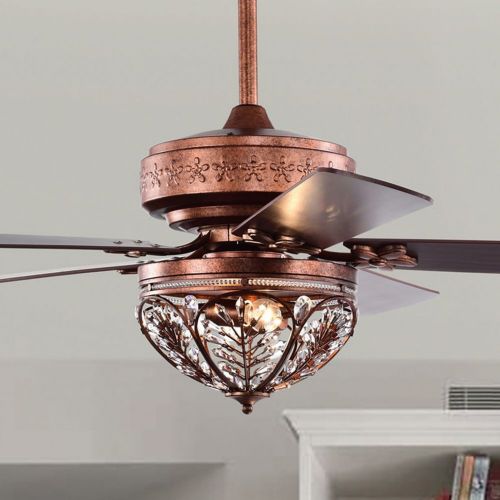 Jacira 52" 2-Light Indoor Antique Copper Finish Chandelier. Get home to a warm and welcoming environment with our 52-inch Antique Copper Jacira Ceiling Fan Chandelier. Our fixture features two 2 lights that are housed in an elegant and crystal embedded shade that is bound to create a breath of fresh air to your living space.