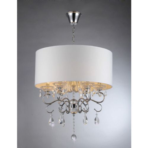 Camilla Crystal Chandelier. This Camilla Crystal Chandelier creates a glamorous sparkling pendant that complements a modern look. Made of clear crystal, Metal, White Faux Silk Drum, stands W23in Deep23in H21in, uses Bulb Qty:6 × 40W type E14a, including 40" chain.