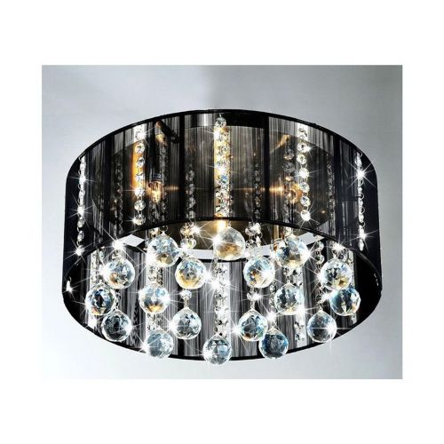 Jasmine Crystal Chandelier. This Jasmine Crystal Chandelier creates a glamorous sparkling pendant that complements a modern look. Made of metal, clear crystal & black fabric, stands H8in W17in and uses 5x40W light bulb type G9.