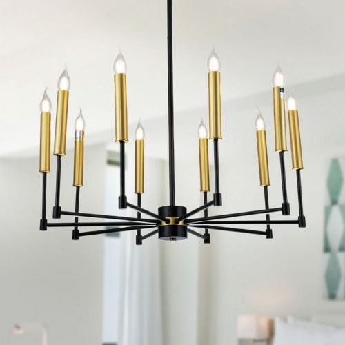 Mizba 29.1" 10-Light Indoor Black and Gold Finish Chandelier. Turn your home into a kingdom with our 29-inch Matte Black Mizba Chandelier. Our fixture features ten lights and adds an aesthetic appeal to your home interior. Both decorative during the day and decoratively functional at night, get the best of both worlds with our 29-inch Mizba Chandelier.