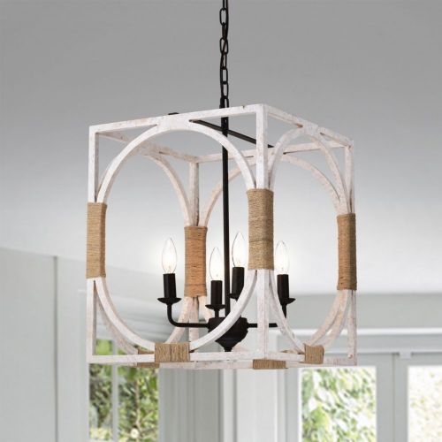 Regulus 14" 4-Light Indoor Weathered White Finish Chandelier. Refreshen your home interior with our 14-inch Weathered White Regulus Chandelier. Garnished with an Oil Rubbed Bronze, our fixture includes a Weathered White shade that is decorated with twine that radiates nicely off of the 4 lights that our chandeliers holds.