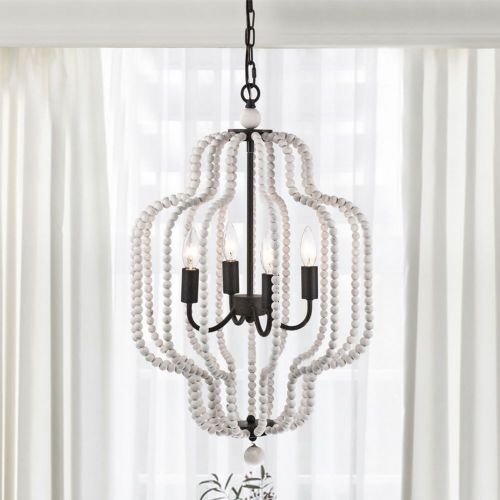 Sauxi 18" 4-Light Indoor Weathered White and Rustic Black Finish Chandelier. Allow your evenings to greet you with a breath of fresh air and a peaceful environment with our 18-inch Weathered White Sauxi Chandelier. Our fixture features four 4 lights that are housed in a lovely Weathered White beaded covered shade and creates an aesthetic perfectly fit for any home.