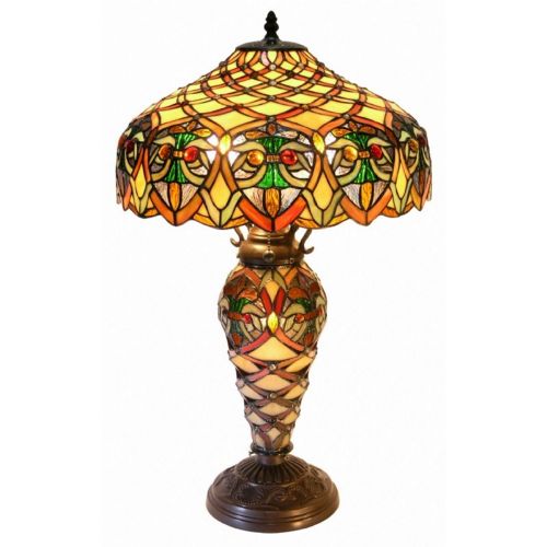 Tiffany Style Arielle Table Lamp has golden yellow tone with amber, red, green and red jewels with illuminated base. It has more than 200pcs. of cut glass individually cut and wrapped around copper foil and soldered together.
