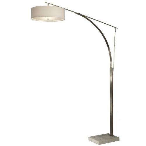 Tangent arc lamp. It is a casual contemporary style arc lamp by Nova Lighting. It is made of steel tubing. It has a brushed nickel and white marble finish. It operates with an incandescent type bulb of 100 watts that is not included. It comes with 2 sockets and a dimmer type of switch that is located at the foot. This is an arc lamp that provides intense illumination.