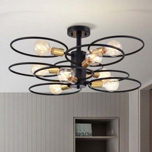 Camilla 28" 9-Light Indoor Matte Black Finish Semi-Flush Mount Ceiling Light with Light Kit and Remote Our 28-inch Matte Black Camilla Ceiling Light packs a serious eye-catching design bound to enhance and amuse those around its presence. Our lighting fixture is also garnished in Gold which puts the cherry on top of what could be, one of your greatest investments to have ever made in your home.