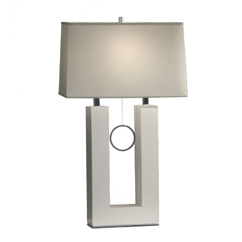 Earring standing table lamp-white. It is a casual contemporary style table lamp by Nova Lighting. It is made of wood-MDF and it has a white gloss, chrome finish. It operates with an incandescent bulb of 100 watts that is not included. It comes with 1 socket and a pull chain single type of switch that is located on the socket.