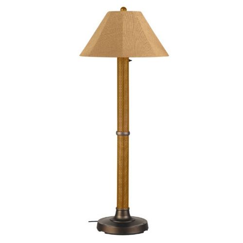 Bahama Weave Outdoor Floor Lamp Mocha Cream & Bronze. All weather PVC wicker woven base adds dramatic appeal to this outdoor lamp. Choose from many diverse colors of Sunbrella fabric shades. 12 ft. weatherproof cord and plug. Two level dimming switch.