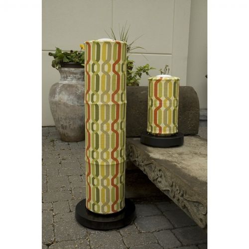 6 super bright white LEDs provide equivalent light output of a 70 watt incandescent bulb while only using 6 watts. Body of the PatioGlo lamp is molded of special UV protected high density frost polyethylene mounted to a weighted resin base. The base includes an energy saving low voltage LED light source designed to provide years of carefree illumination. Accented with colorful outdoor fabric cover. Completely weatherproof with nothing to rust or corrode. Great for seaside environments. Includes remote control with on/off and dimming functions.