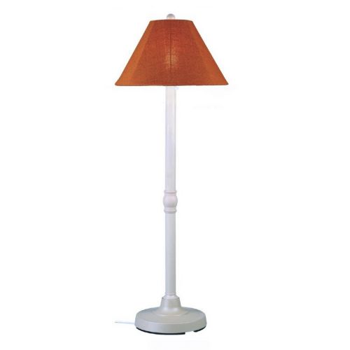 San Juan Outdoor Floor Lamp White. All weather resin lamp adds practicality and style to your outdoor living area. 2" white resin body tube, heavy weighted base and unbreakable polycarbonate waterproof bulb enclosure allows the use of a standard 100 watt bulb. 12 ft. weatherproof cord and plug. Two level dimming switch. Choose from many diverse colors of Sunbrella fabric shades.