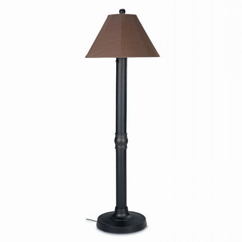 Seaside bronze outdoor floor lamp. Simple fashionable outdoor lamp brings light to your outdoor living area. All lamps feature resin construction with heavy weighted bases for outdoor environments. Lamps are completely weatherproof and have a two level dimming switch and weatherproof cord and plug, 12 ft. cord. Unbreakable polycarbonate waterproof light bulb enclosure allows use of standard 100 watt light bulb. Floor lamps are 60" tall. Floor lamp Sunbrella shade is 71/2" × 111/2" × 20". Choose from 24 Sunbrella colors. Lamp body is bronze.