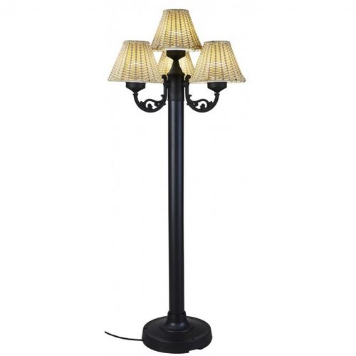 Add European Elegance to your outdoor living area with this Versailles floor lamp. Powder coated black finish on cast aluminum body. Highlighted by 4 all weather wicker shade covers. Two level dimming switch and 12 ft. weatherproof cord and plug. Acrylic waterproof light bulb enclosures allow the use of standard 60 watt bulbs or comparable LED or CFL bulbs.