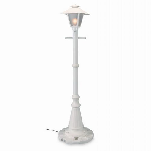 Cape Cod portable patio lamp. Inspired by turn of the century gas flame lanterns. Cape Cod electric patio lamps feature frosted bevel panels and all resin construction. 82 inches tall. Large 13 inches square lantern has a two level dimming and on and off switch. 10 ft weather resistant cord. Uses 100 watt bulb. Base holds 40 lbs of sand. Base is 22 inches in diameter. Color: White.