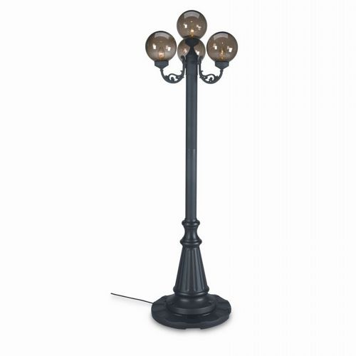 European four globe portable patio lamp. Inspired by Italian Renaissance period. Weatherproof street style patio lamp. Powder coated aluminum construction with resin base. Bronze acrylic break resistant globes. Two level dimming switch. 10 Ft. grounded cord. 80 inches tall. Base diameter 20 inches. Available in black with bronze globe. Accepts four 60 watt bulbs.