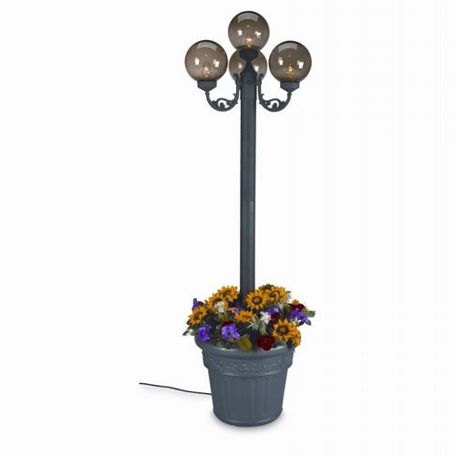 European four globe portable planter patio lamp. Inspired by Italian Renaissance period. Weatherproof street style planter patio lamp. Powder coated aluminum construction with resin base. Bronze acrylic break resistant globes. Two level dimming switch. 10 Ft. grounded cord. 80 inches tall. Base diameter 20 inches. Available in black with bronze globe. Accepts four 60 watt bulbs.