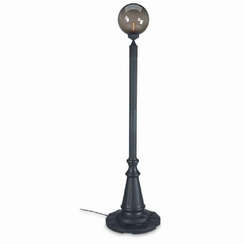 European globe portable patio lamp. Inspired by Italian Renaissance period. Weatherproof street style patio lamp. Powder coated aluminum construction with resin base. Bronze acrylic break resistant globes. Two level dimming switch. 10 Ft. grounded cord. 85 inches tall. Base diameter 20 inches. Available in black with bronze globe. Accepts 100 watt bulb.