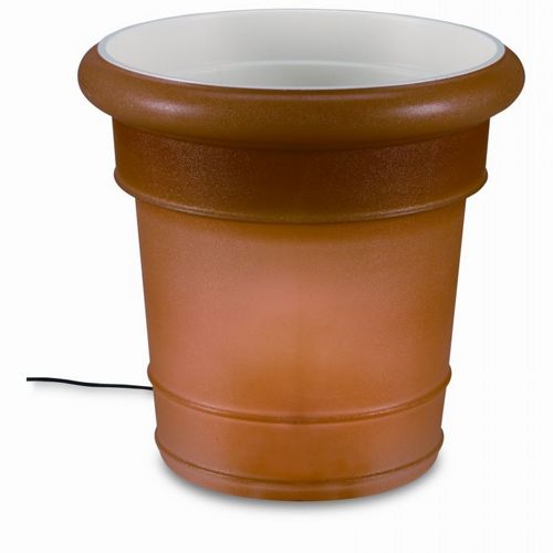 GardenGlo electric garden planter lamp from Patio Living Concepts. Large clarified resin planter enhances any patio and garden setting and lights the night. Outdoor resistant. The 120V electric planter has a 12 foot cord and plug and a 4000 hour 9 watt fluorescent bulb. Large planter is 21 inch in diameter and 21 inches high.Color: Terracotta.